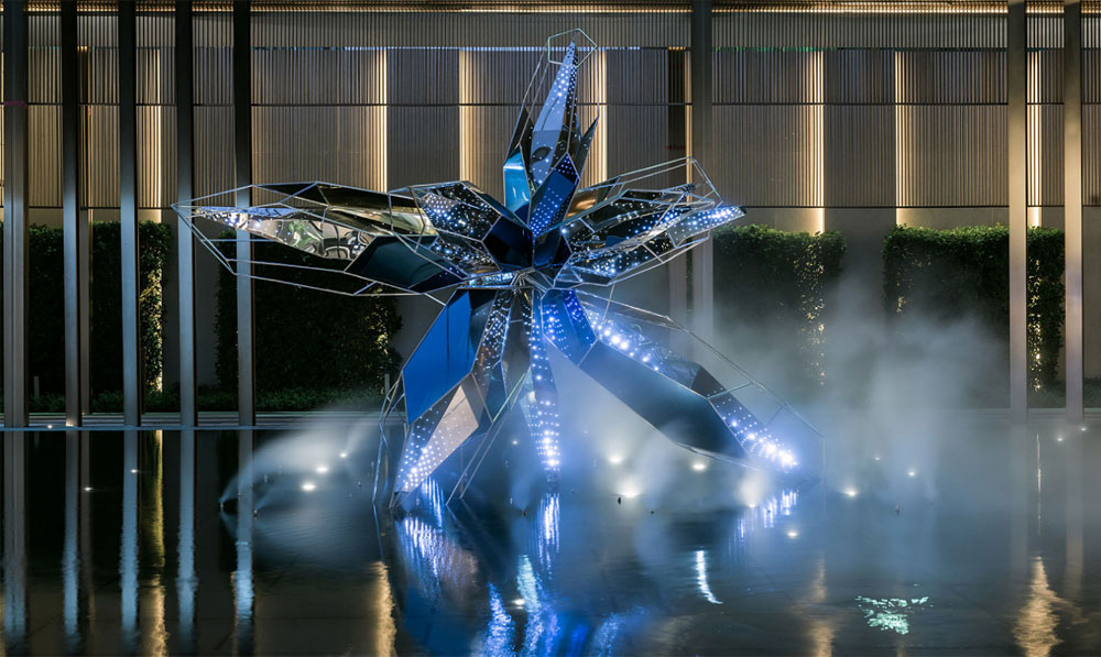设计说明:设计创想一颗外来的宝物,化作流星划破天际,降落于项目宝地,并打造其魔幻的造型、身上烙印着火花般的灯光,底部还漂浮着刚降落引起的烟尘与水雾... ...